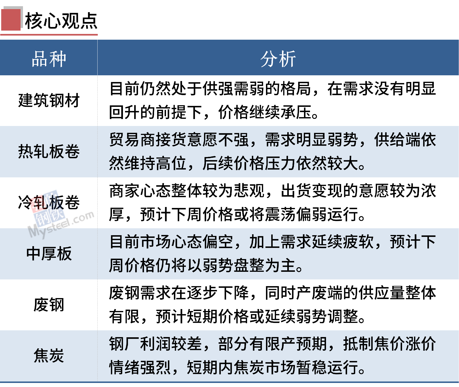 受南方暴雨北方高溫天氣影響,加之居民購房和企業(yè)投資信心尚待時間恢復(fù),淡季特征明顯,本周鋼材需求進(jìn)一步萎縮,庫存出現(xiàn)累增。在更大力度的宏觀政策出臺之前,需求或延續(xù)疲弱態(tài)勢。隨著鋼價持續(xù)下跌,鋼廠虧損幅度擴(kuò)大,本周電弧爐鋼廠進(jìn)一步減產(chǎn),但長流程鋼廠減產(chǎn)力度不大,預(yù)計后期更多鋼廠會安排減產(chǎn),打壓鐵礦石等原燃料價格。短期內(nèi),鋼市供需壓力仍大,加之成本下移,鋼價延續(xù)弱勢運(yùn)行。