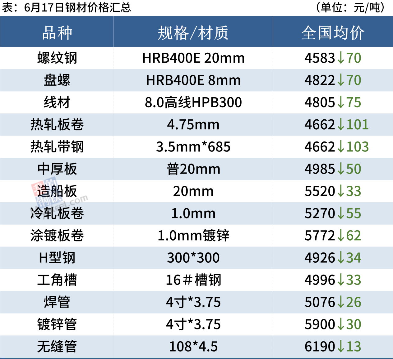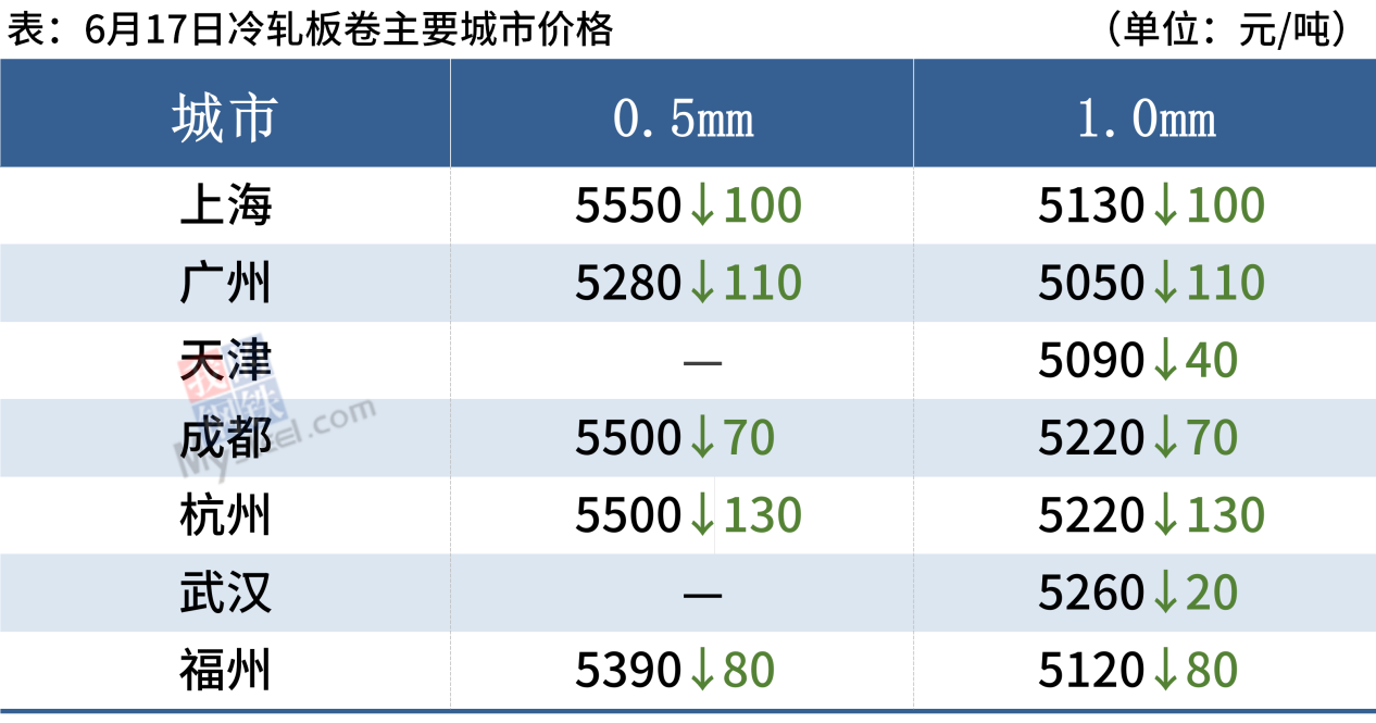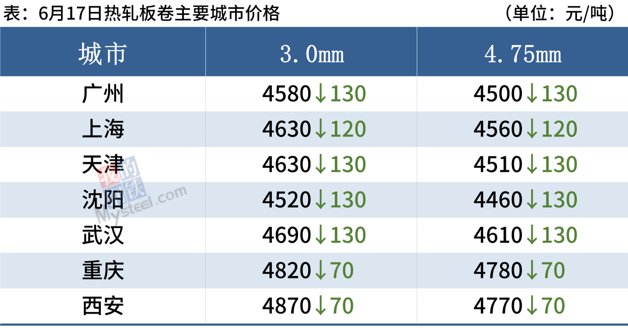熱軋板卷:6月17日,全國24個主要城市4.75mm熱軋板卷均價4662元/噸,較上個交易日下跌101元/噸。早盤開盤下跌,但跌后成交一般,午后受盤面影響,價格進(jìn)一步下跌,各地純現(xiàn)貨貿(mào)易商已經(jīng)全部進(jìn)入虧損狀態(tài),而鋼廠前期高價原料還沒有消化完,本輪跌后基本也已經(jīng)擊穿鋼廠成本,已經(jīng)有出現(xiàn)主動減產(chǎn)情況,但減產(chǎn)范圍不大,并沒有大規(guī)模減產(chǎn)。整體來看,貿(mào)易商繼續(xù)接貨意愿不強(qiáng),需求目前明顯弱勢,供給端依然維持高位,日均粗鋼依然高于去年同期,后續(xù)壓力依然較大。若雨季過后,相應(yīng)政策刺激下需求開始回升,價格仍有回補(bǔ)可能,但目前仍需合理降低庫存警惕風(fēng)險。