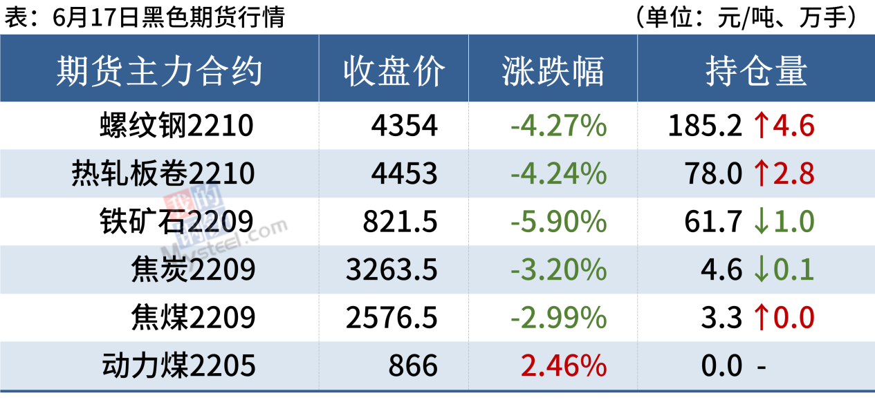 焦炭:6月17日,焦炭市場持穩(wěn)運(yùn)行。焦企開工一般,場內(nèi)焦炭零庫存或者低位運(yùn)行,焦企走貨順暢,即產(chǎn)即銷。鋼廠方面,據(jù)Mysteel跟蹤了解,6月底-7月份唐山及周邊共計7家鋼企10座高爐計劃檢修減產(chǎn),檢修容積共計13960m3,日均影響鐵水產(chǎn)量約3.47萬噸(包含4座高爐為產(chǎn)能置換淘汰產(chǎn)能)。鋼廠開工高穩(wěn),補(bǔ)庫需求仍存,但隨著焦炭兩輪漲價落地后鋼材市場仍在持續(xù)走弱,鋼廠利潤較差,部分有限產(chǎn)預(yù)期,抵制焦價漲價情緒強(qiáng)烈。短期內(nèi)焦炭市場暫穩(wěn)運(yùn)行。