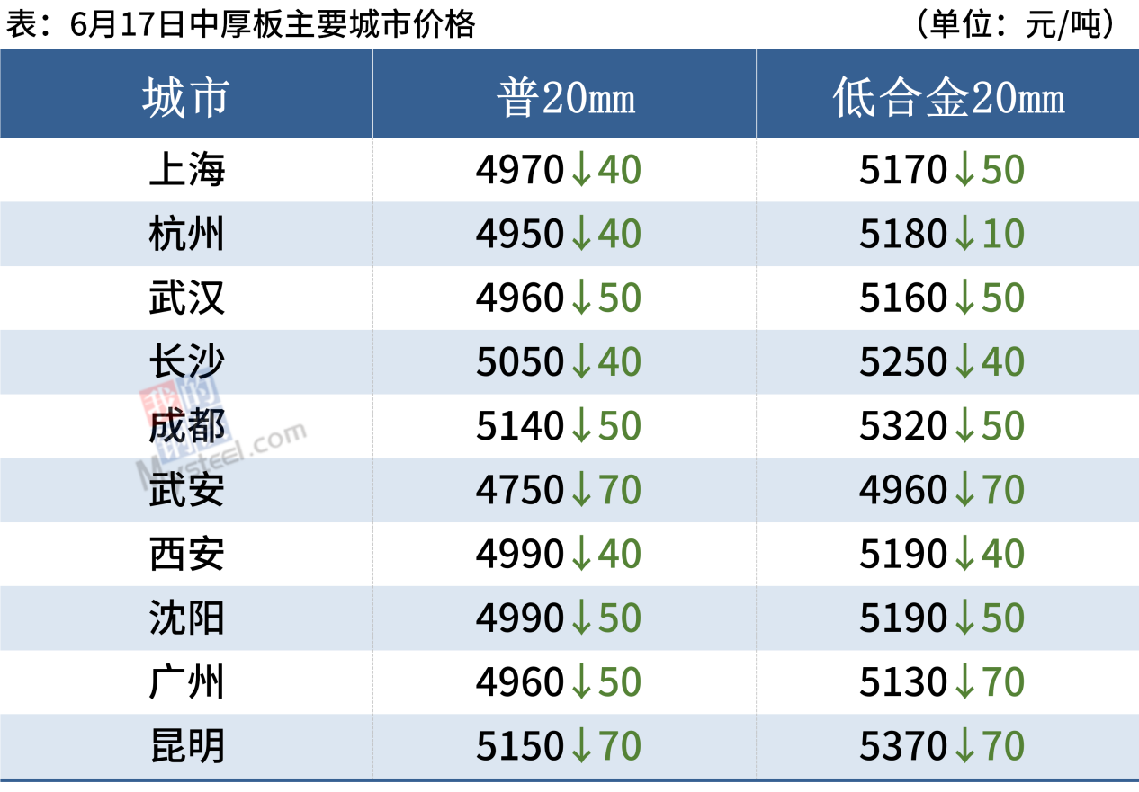 中厚板:6月17日,全國24個主要城市20mm普板均價4985元/噸,較上一交易日下跌50元/噸。在盤面弱勢下行的影響下,多數(shù)市場商家心態(tài)逐步轉(zhuǎn)弱,加上近期多數(shù)區(qū)域下游需求表現(xiàn)疲軟,中厚板現(xiàn)貨成交難有放量,因此全天主流市場價格跟隨下探,但全天成交仍表現(xiàn)清淡。資源方面,現(xiàn)南北價差不具批量南下優(yōu)勢,加上市場去庫速度較慢,目前商戶補(bǔ)貨意愿不強(qiáng)。綜合來看,目前市場心態(tài)偏空,加上需求延續(xù)疲軟,預(yù)計下周全國中厚板價格仍將以弱勢盤整為主。