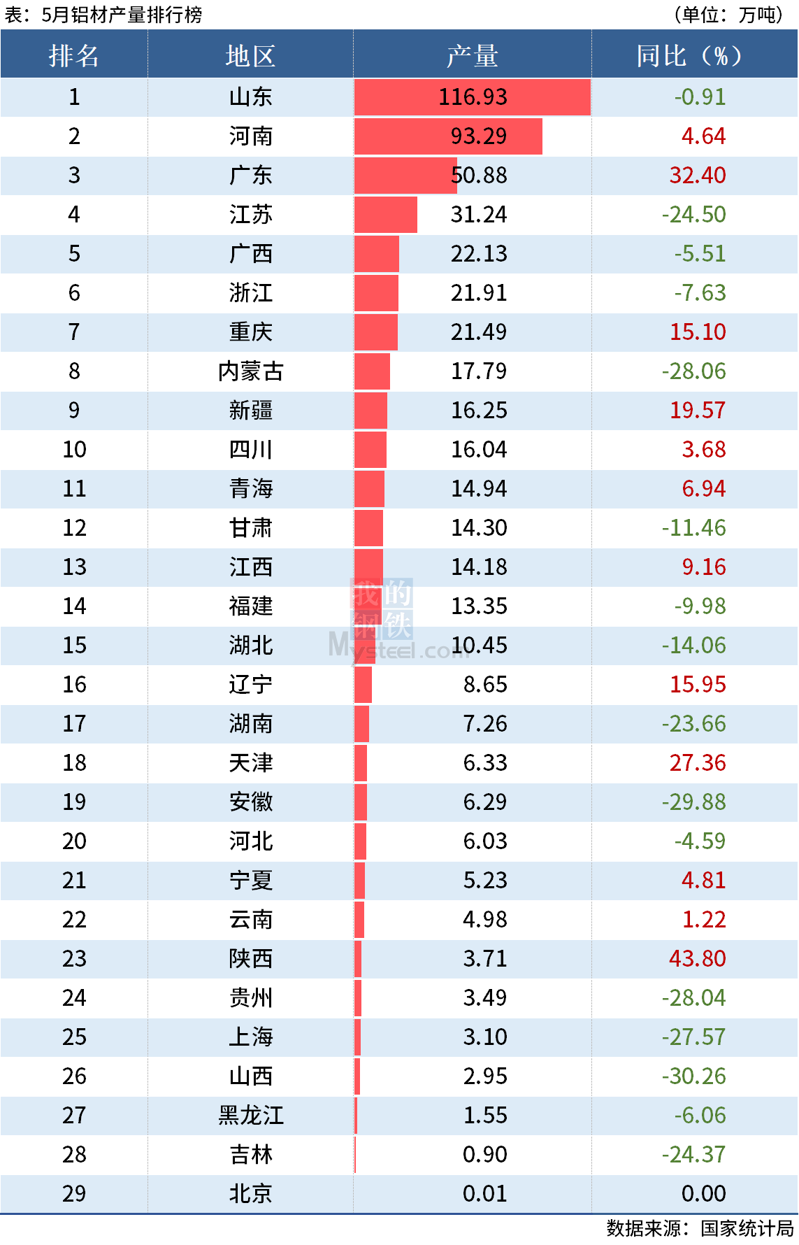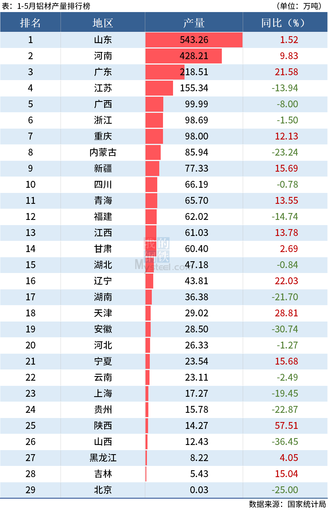 國家統(tǒng)計局?jǐn)?shù)據(jù)顯示,2022年5月全國鋁材產(chǎn)量535.6萬噸,1-5月鋁材產(chǎn)量2451.9萬噸。其中,前5月山東、河南和廣東鋁材產(chǎn)量分別同比增長1.52%、9.83%和21.58%。