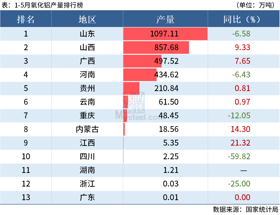 國家統(tǒng)計局?jǐn)?shù)據(jù)顯示,2022年5月全國氧化鋁產(chǎn)量698.8萬噸,1-5月氧化鋁產(chǎn)量3235.1萬噸。其中,前5月山東氧化鋁產(chǎn)量同比下降6.58%,山西和廣西氧化鋁產(chǎn)量分別同比增長9.33%和7.65%。