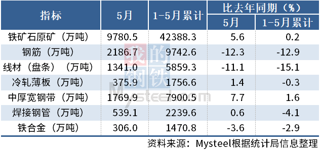 5月份,中國(guó)鐵礦石原礦產(chǎn)量為9780.5萬(wàn)噸,同比增長(zhǎng)5.6%;1-5月累計(jì)產(chǎn)量為42388.3萬(wàn)噸,同比增長(zhǎng)0.2%。