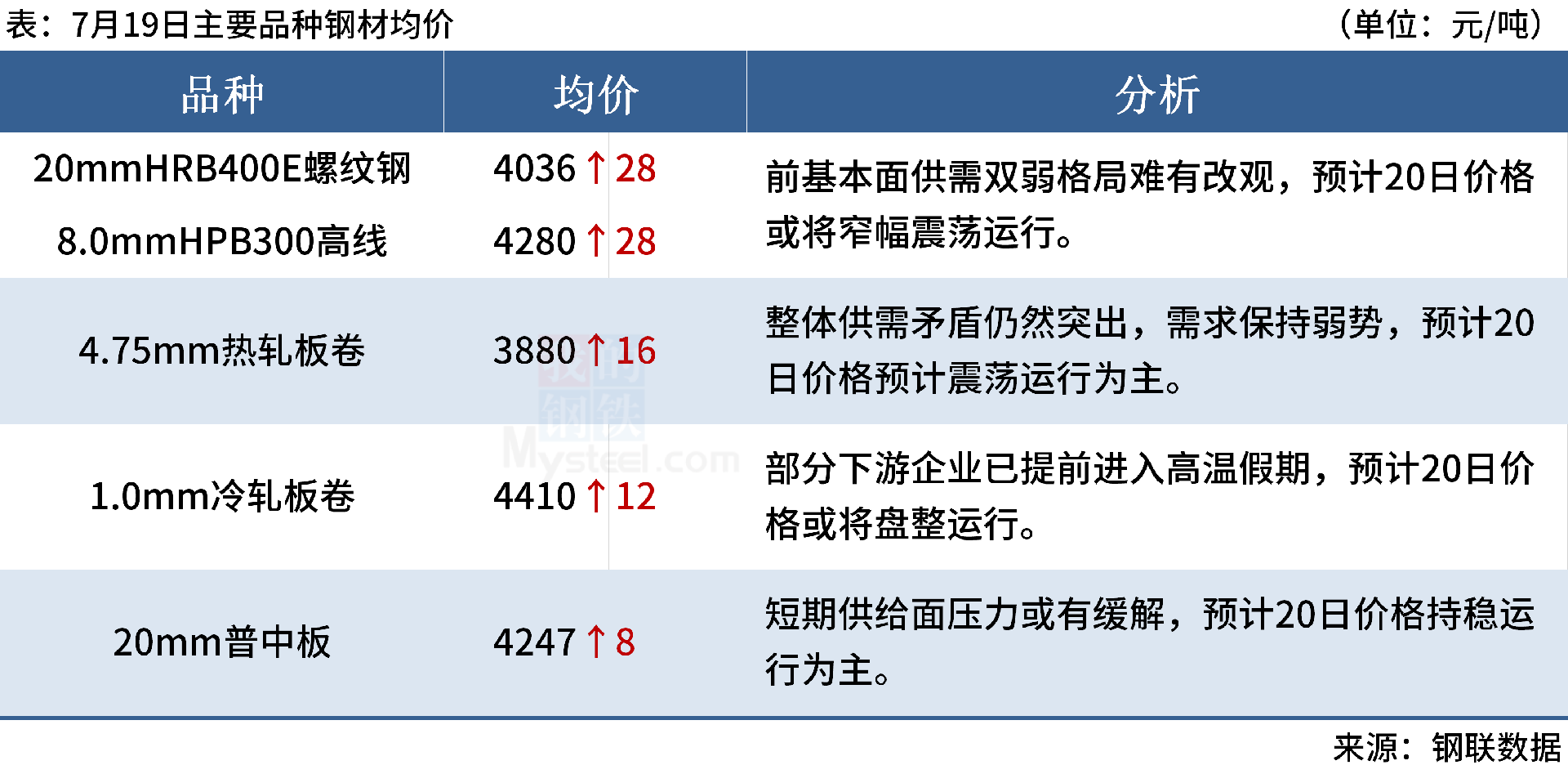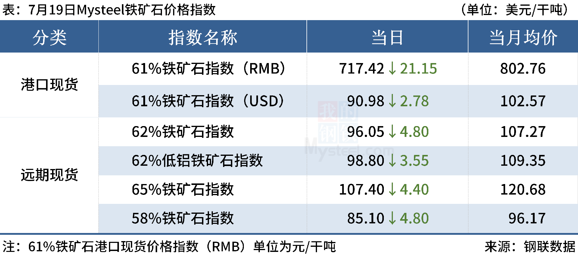 ◎ 7月19日,全國(guó)主港鐵礦石成交45.00萬噸,環(huán)比減31.8%;237家主流貿(mào)易商建材成交14.80萬噸,環(huán)比減26.1%。