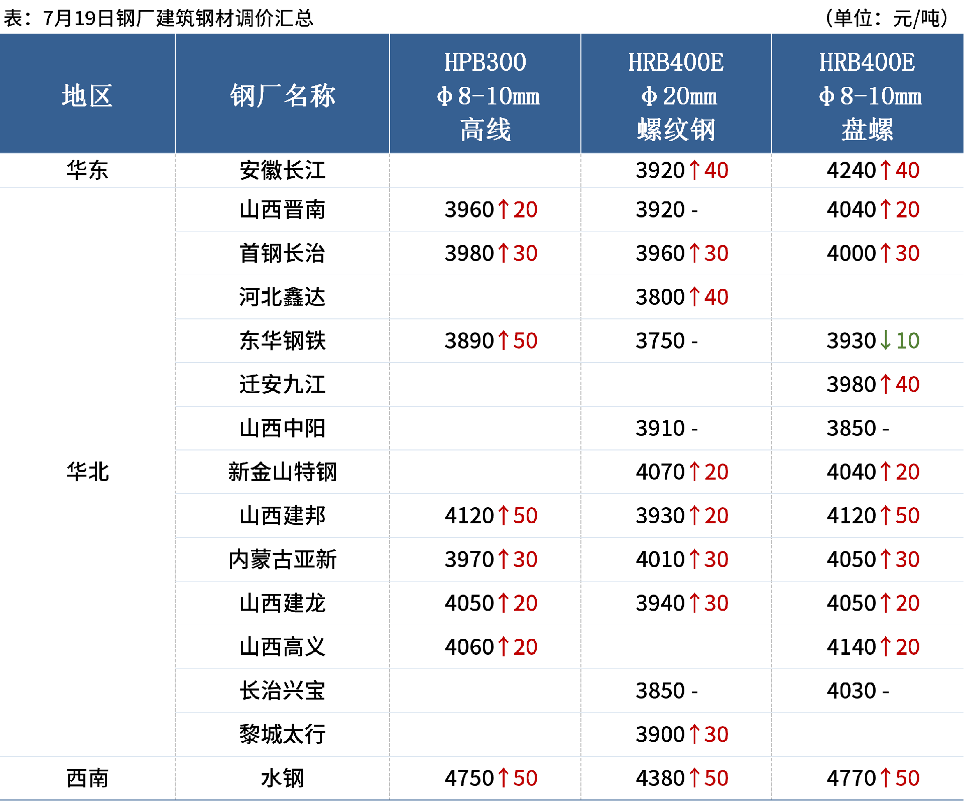 ◎ 截至7月19日,國(guó)內(nèi)37家鋼廠發(fā)布檢修計(jì)劃。其中,山東廣富集團(tuán)19日起全面停產(chǎn),復(fù)產(chǎn)時(shí)間待定。涉及高爐450m3兩座,750m3三座,60噸轉(zhuǎn)爐1座,80噸轉(zhuǎn)爐2座,50噸電爐1座,100噸電爐1座。涉及煉鐵產(chǎn)能350萬噸/年,煉鋼產(chǎn)能396萬噸/年。詳情>>