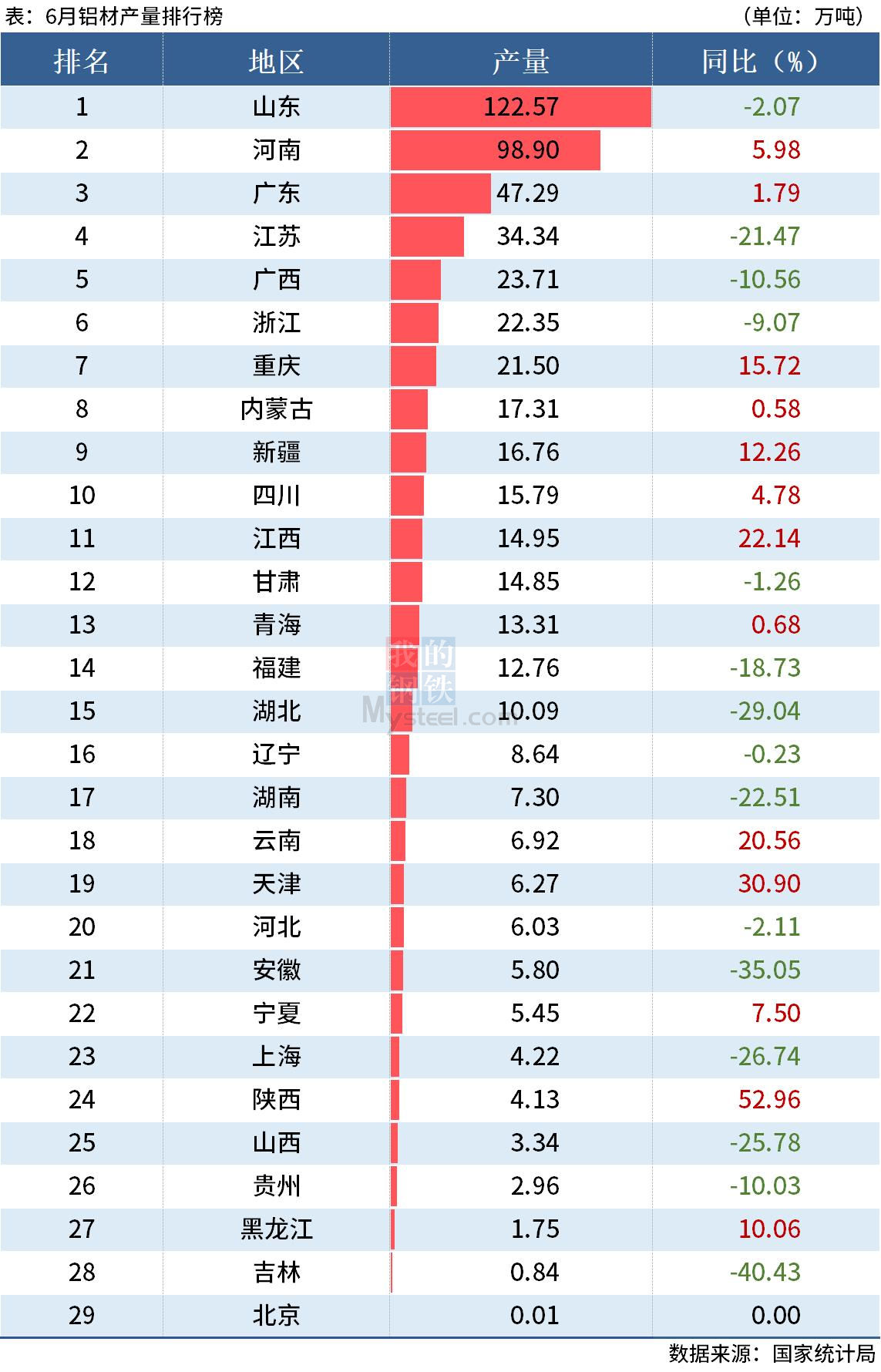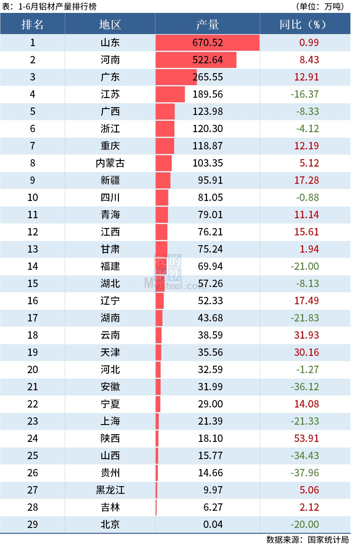 國家統(tǒng)計局數(shù)據(jù)顯示,6月全國鋁材產(chǎn)量550.1萬噸,同比下降6.7%;1-6月累計產(chǎn)量2999.4萬噸,同比下降2.8%。其中,上半年山東、河南和廣東鋁材產(chǎn)量分別同比增長0.99%、8.43%和12.91%。