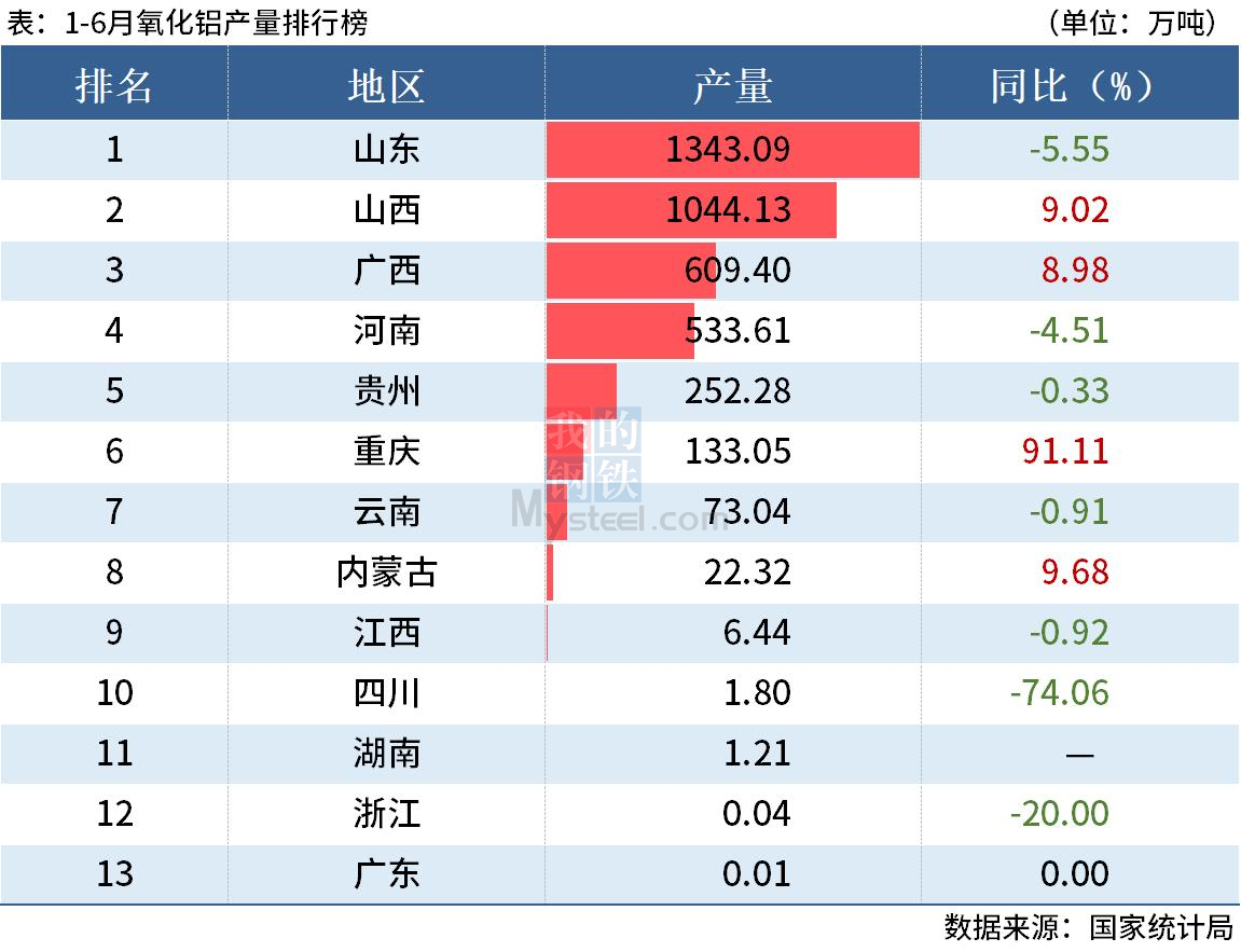 國家統(tǒng)計局數(shù)據(jù)顯示,2022年6月全國氧化鋁產(chǎn)量731.7萬噸,同比增長7.4%;1-6月累計產(chǎn)量4020.4萬噸,同比增長2.3%。其中,上半年山東氧化鋁產(chǎn)量同比下降5.55%,山西和廣西氧化鋁產(chǎn)量分別同比增長9.02%和8.98%。