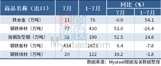 7月,中國(guó)出口鋼鐵棒材77萬(wàn)噸,同比增長(zhǎng)51.0%;1-7月累計(jì)出口430萬(wàn)噸,同比下降26.4%。其他出口情況如下表所示:
