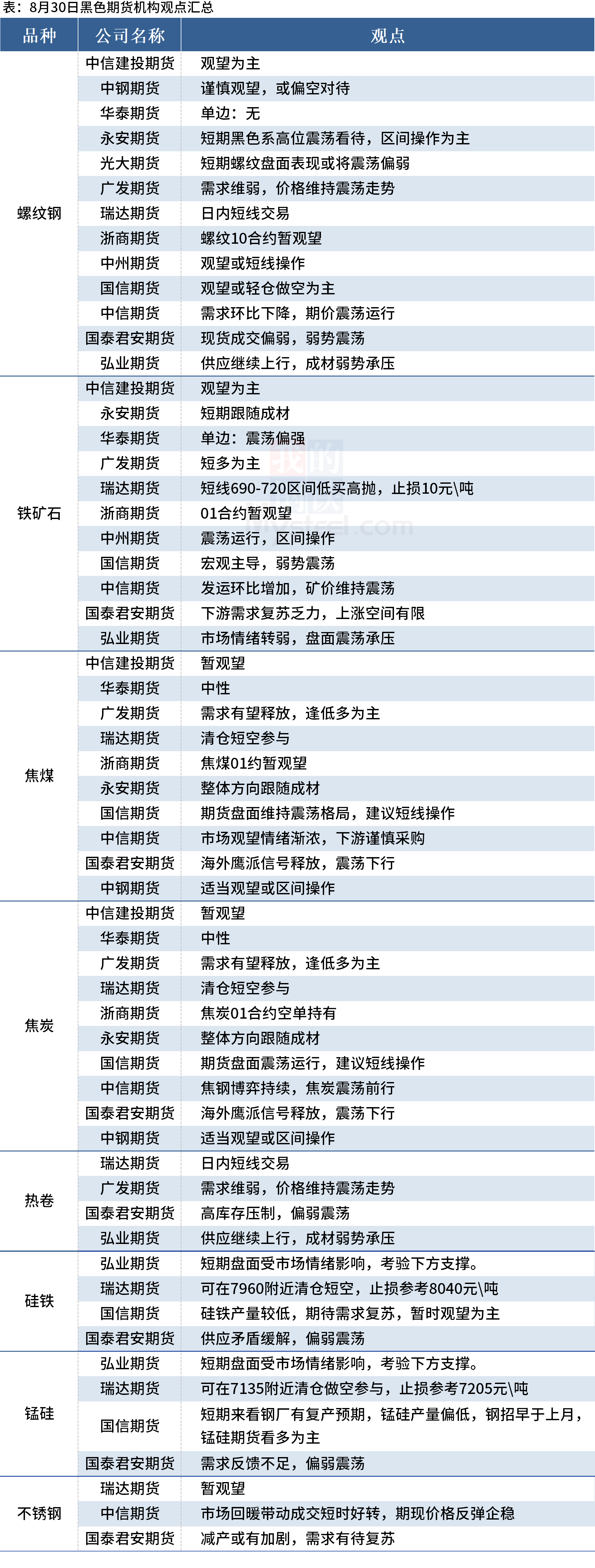 據(jù)Mysteel統(tǒng)計8月30日13家期貨機構(gòu)操作策略,其中多數(shù)機構(gòu)料螺紋鋼震蕩偏弱,建議鐵礦石震蕩運行,焦煤、焦炭震蕩運行。具體匯總內(nèi)容如下:
