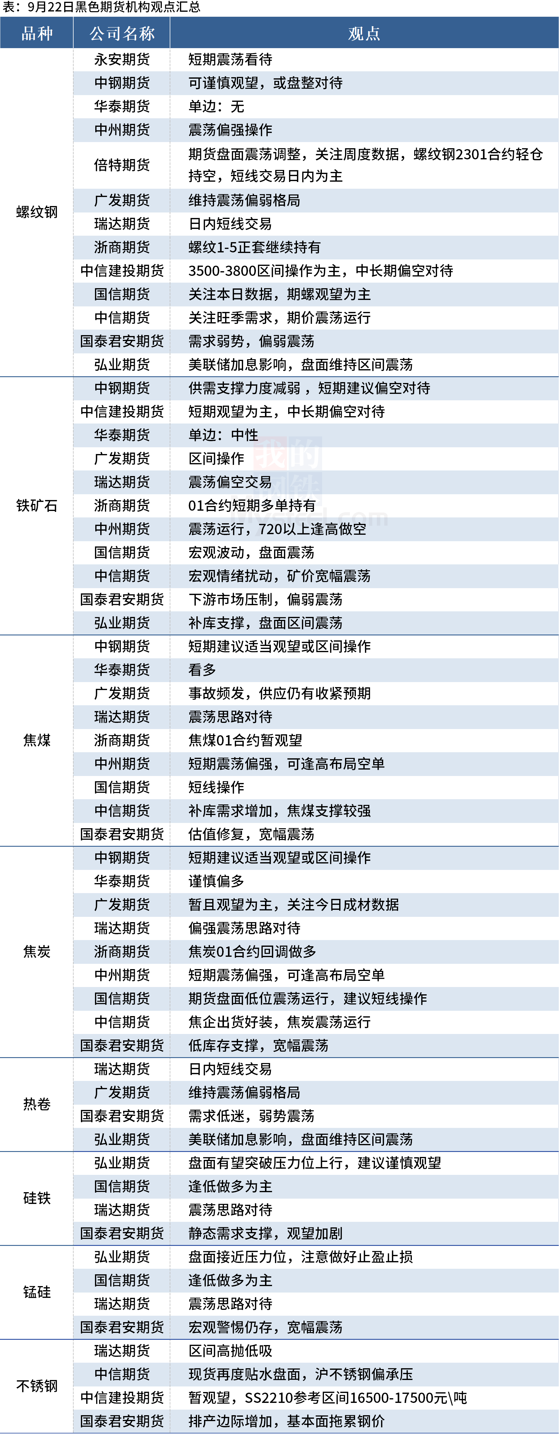 據(jù)Mysteel統(tǒng)計9月22日13家期貨機構(gòu)操作策略,其中多數(shù)機構(gòu)料螺紋鋼震蕩運行,建議鐵礦石震蕩運行,焦煤、焦炭震蕩運行。具體匯總內(nèi)容如下: