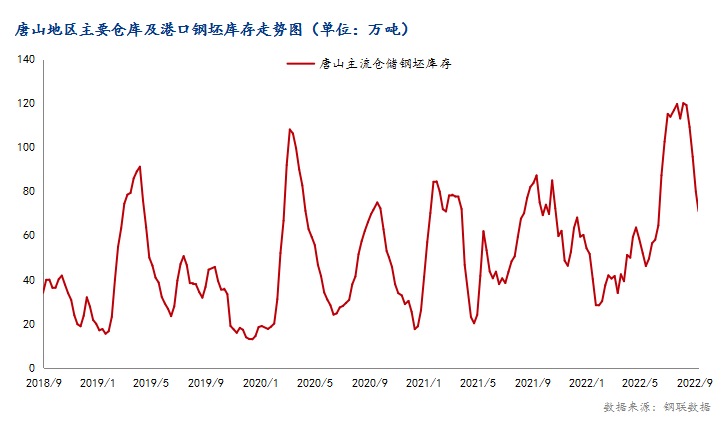截止9月29日,本周唐山主要倉庫及港口同口徑鋼坯庫存64.11萬噸,周環(huán)比下降5.36萬噸。調(diào)研周期內(nèi),下游運(yùn)輸基本恢復(fù)正常,疊加節(jié)前補(bǔ)庫需求,倉儲庫存降庫為主;港口方面,港口資源陸續(xù)疏港。