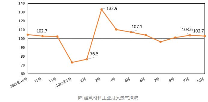 2022年10月份建筑材料工業(yè)景氣指數(shù)為102.7點(diǎn),比上月回落0.9點(diǎn),高于臨界點(diǎn),建筑材料工業(yè)仍處于景氣區(qū)間。