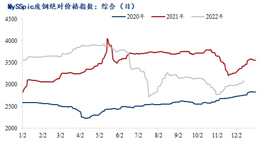 截止12月13日,Mysteel廢鋼絕對價(jià)格指數(shù)在3083.5元/噸,日環(huán)比上漲26.5元/噸。