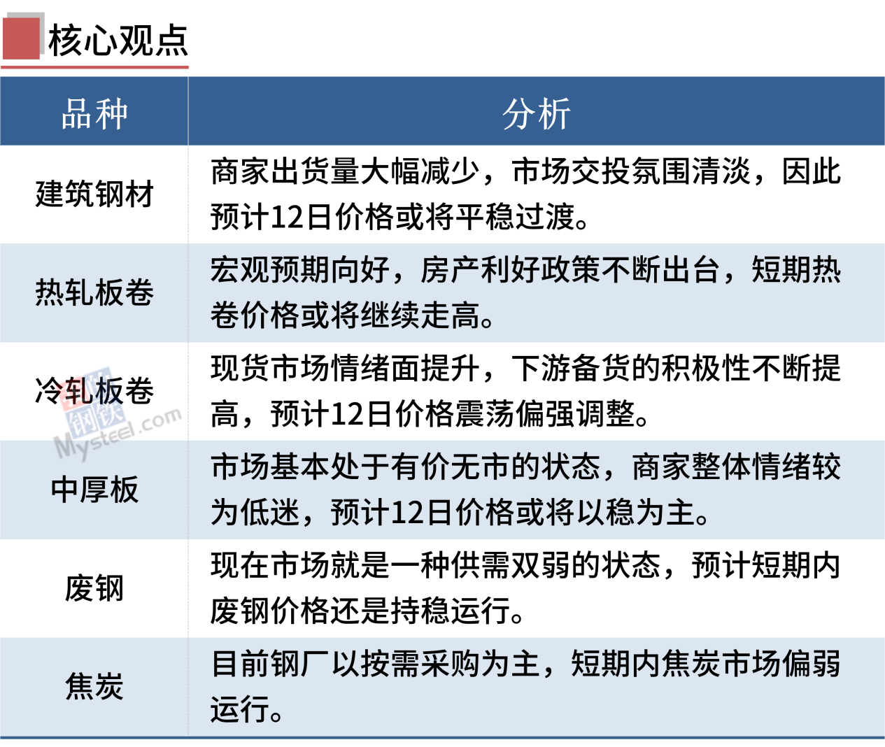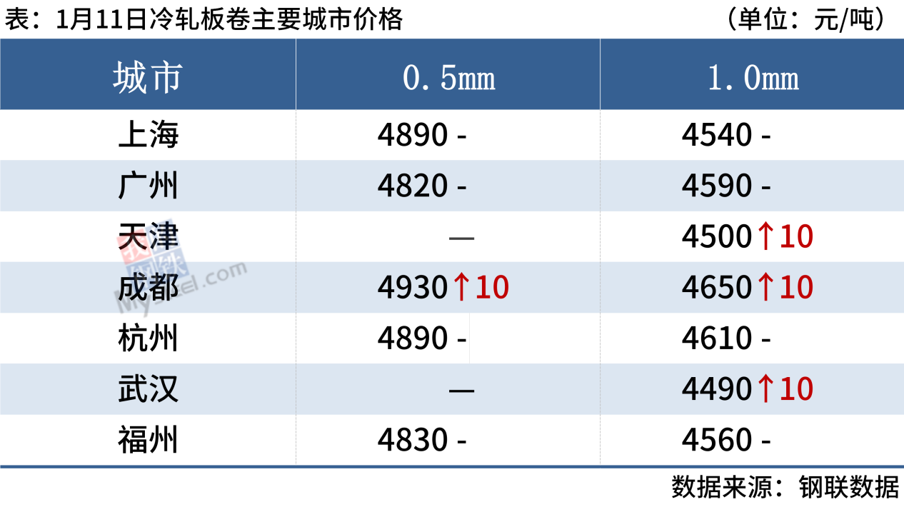 冷軋板卷:1月11日,全國24個主要城市1.0mm冷卷均價4619元/噸,較上個交易日上漲2元/噸。盡管臨近放假,但是生產(chǎn)端價格持續(xù)上行,多數(shù)商家在成本較高以及對后市預(yù)期較強的情況下,近些天報價基本以穩(wěn)為主或者跟隨期貨小幅探漲,而部分商家為盡量避免庫存增速較快,暗走出貨。成交方面,本周終端客戶已經(jīng)陸續(xù)放假,市場交投氛圍較為冷清,華南市場冷軋板卷大戶成交基本集中在200噸左右。另外,近期價格多隨期貨調(diào)整,市場基本處于有價無市的狀態(tài),商家整體情緒較為低迷。綜合來看,預(yù)計12日國內(nèi)冷軋板卷價格或?qū)⒁苑€(wěn)為主。