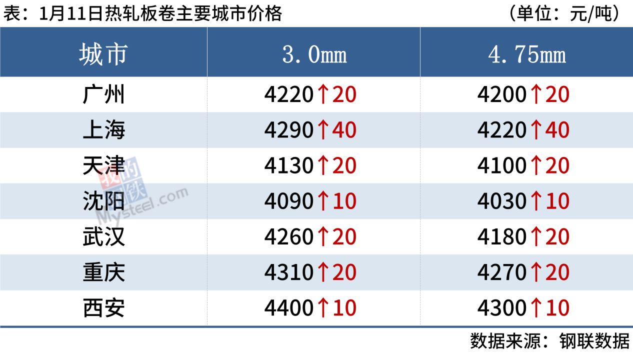 熱軋板卷:1月11日,全國24個主要城市4.75mm熱軋板卷均價4208元/噸,較上個交易日上漲20元/噸。隨著大部分鋼貿(mào)放假離場,表需和成交季節(jié)性下滑,且由于擔心節(jié)后行情走勢,多數(shù)商貿(mào)為被動冬儲。另一方面,節(jié)前實際成交低迷,但宏觀預(yù)期向好,房產(chǎn)利好政策不斷出臺,短期熱卷價格或?qū)⒗^續(xù)走高。綜合來看,預(yù)計熱軋板卷價格或?qū)⑵珡娺\行。