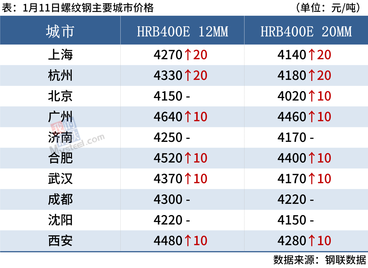 1月11日,3家鋼廠上調(diào)建筑鋼材出廠價20-50元/噸。