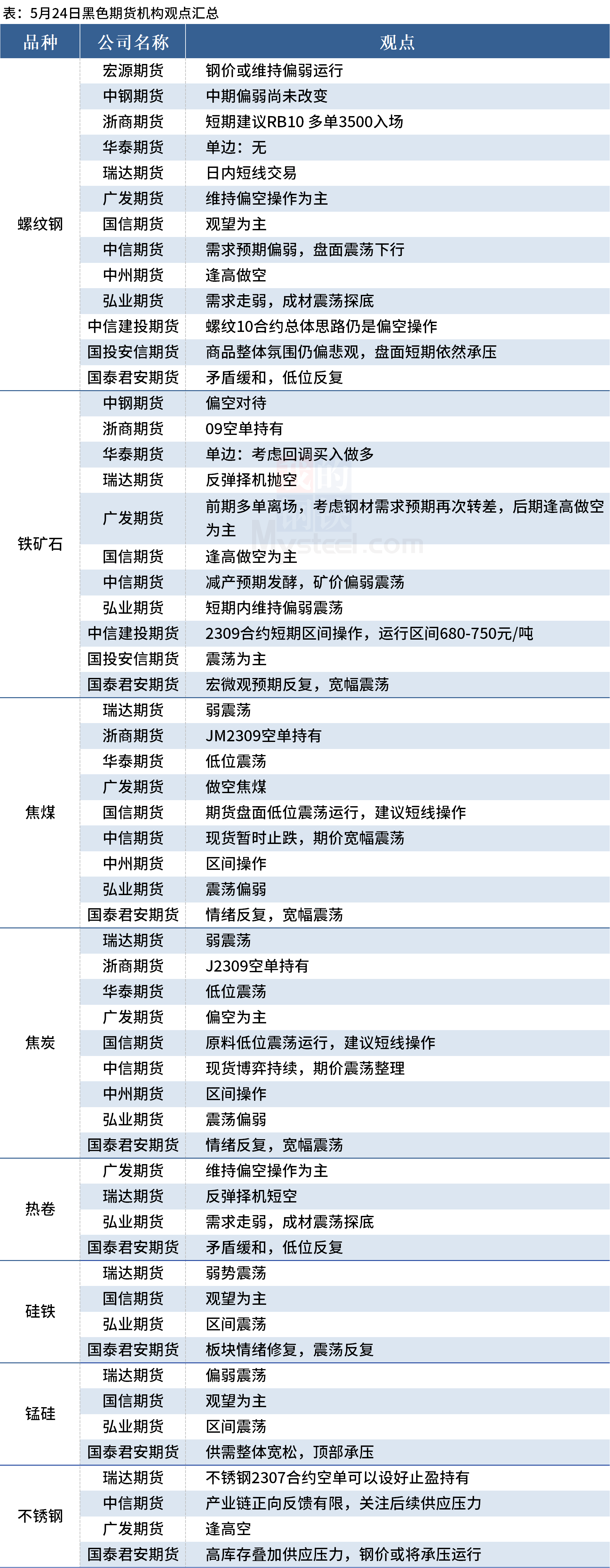 據(jù)Mysteel統(tǒng)計(jì)5月24日13家期貨機(jī)構(gòu)操作策略,其中多數(shù)機(jī)構(gòu)料螺紋鋼震蕩運(yùn)行,鐵礦石震蕩運(yùn)行,焦煤、焦炭震蕩運(yùn)行。具體匯總內(nèi)容如下: