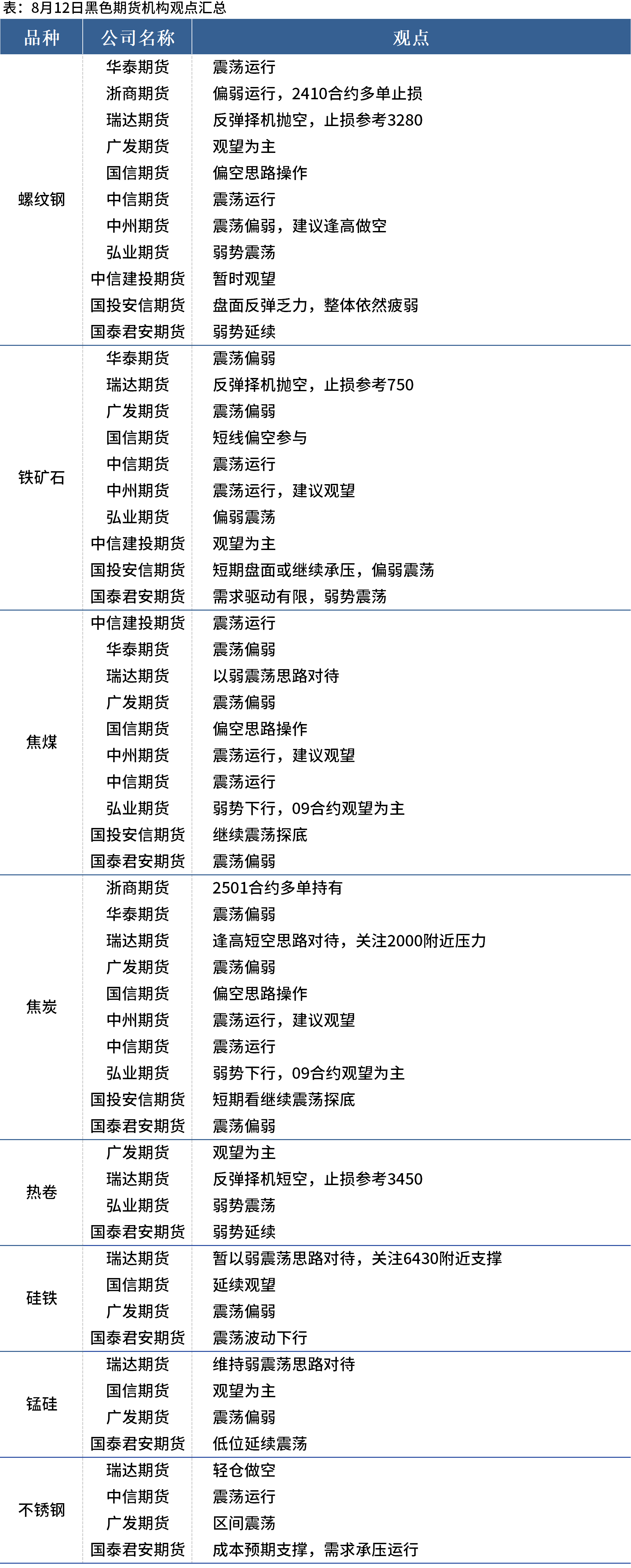 據(jù)Mysteel統(tǒng)計8月12日11家期貨機構(gòu)操作策略,其中多數(shù)機構(gòu)料螺紋鋼震蕩運行,鐵礦石弱勢震蕩,焦煤、焦炭震蕩偏弱。具體匯總內(nèi)容如下: