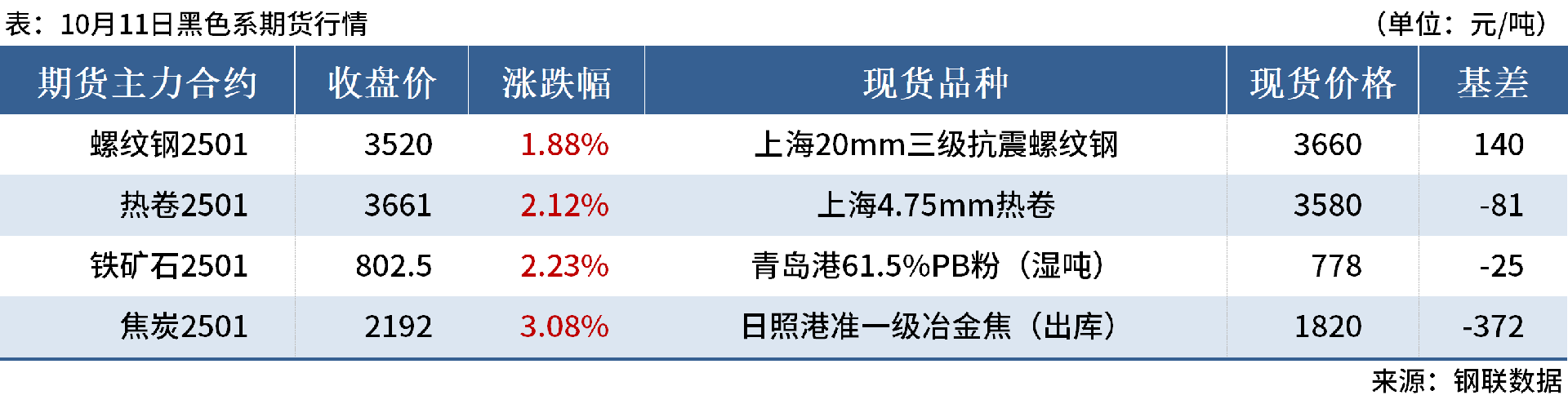 ◎10月11日,全國主港鐵礦石成交89.50萬噸,環(huán)比減20.8%;237家主流貿(mào)易商建筑鋼材成交12.51萬噸,環(huán)比減4.8%。