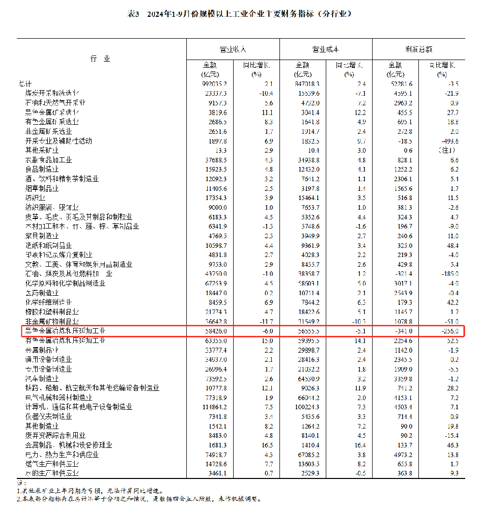 1-9月份,黑色金屬冶煉和壓延加工業(yè)利潤總額虧損341億元。
