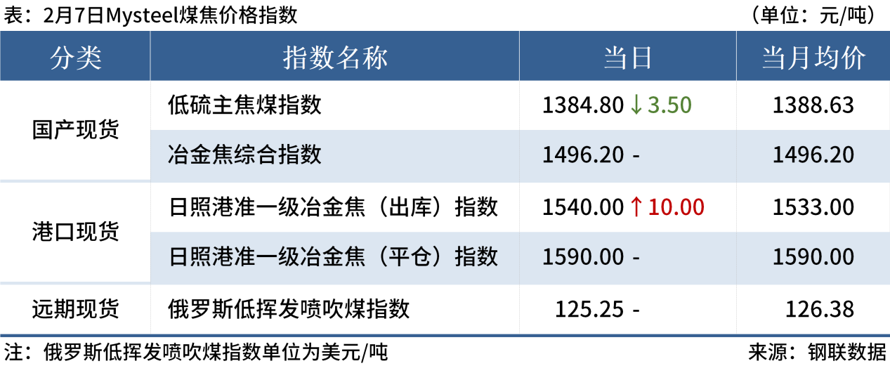 ◎ 2月7日,唐山、天津地區(qū)部分鋼廠對(duì)焦炭開啟第八輪提降,降幅50-55元/噸,預(yù)計(jì)將于2月10日落地。
