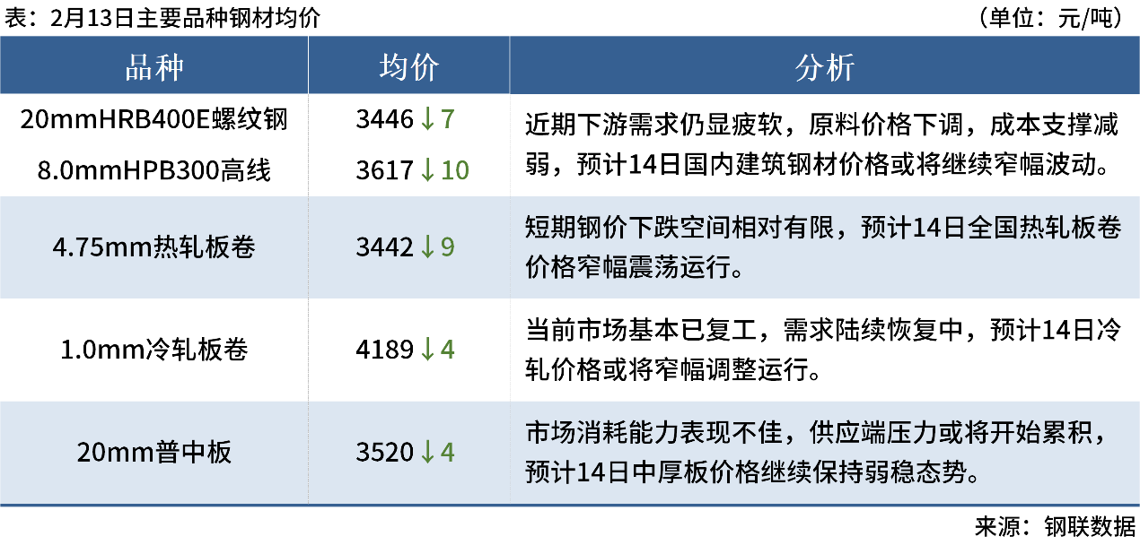 ◎2月13日,全國(guó)主港鐵礦石成交114.30萬(wàn)噸,環(huán)比增12.1%;237家主流貿(mào)易商建筑鋼材成交5.08萬(wàn)噸,環(huán)比增15.2%。
