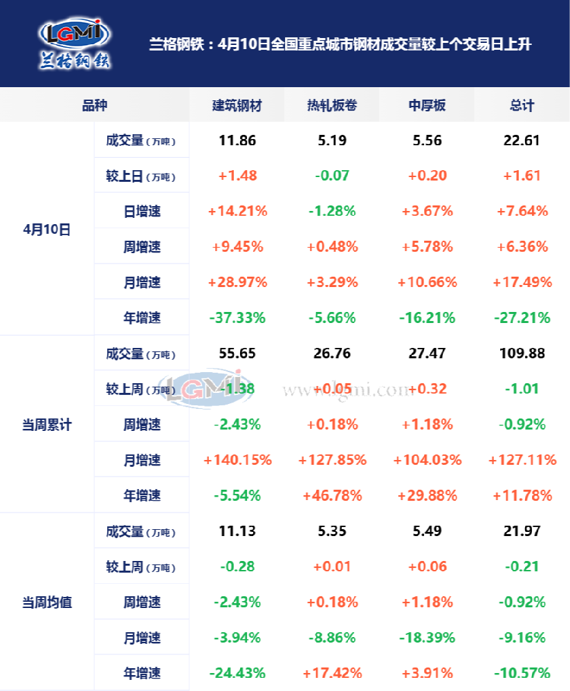 一、4月10日全國重點城市鋼材成交量22.61萬噸,較上周上升6.36%