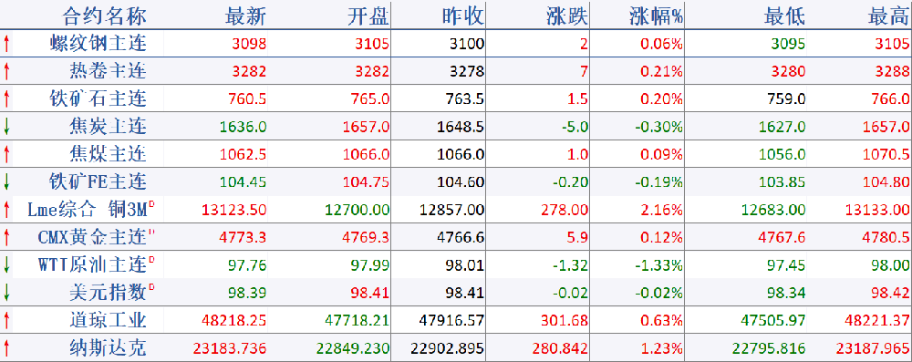 黑色系商品夜盤(pán)多數(shù)收漲,但幅度有限,主力合約中熱卷漲0.21%,螺紋漲0.06%,鐵礦石和焦煤漲幅也較小,焦炭略微收跌。目前黑色多數(shù)品種進(jìn)入技術(shù)性反彈,上行驅(qū)動(dòng)不足,螺紋主力一直在3100關(guān)口博弈。而現(xiàn)貨市場(chǎng)普遍以穩(wěn)為主,市場(chǎng)對(duì)4月中下旬信心不足,交易偏謹(jǐn)慎。下一步,繼續(xù)關(guān)注高庫(kù)存消化速度,需求的真實(shí)感受。而中東局勢(shì)亦未能讓原油再次大漲,對(duì)黑色市場(chǎng)影響更為有限。